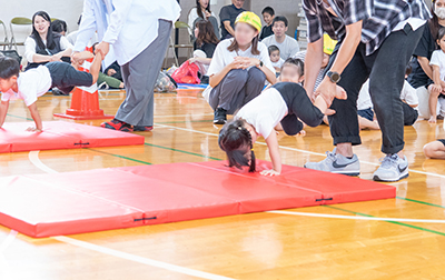 親子で工事車両になりきってゴールを目指したすみれ組さん。