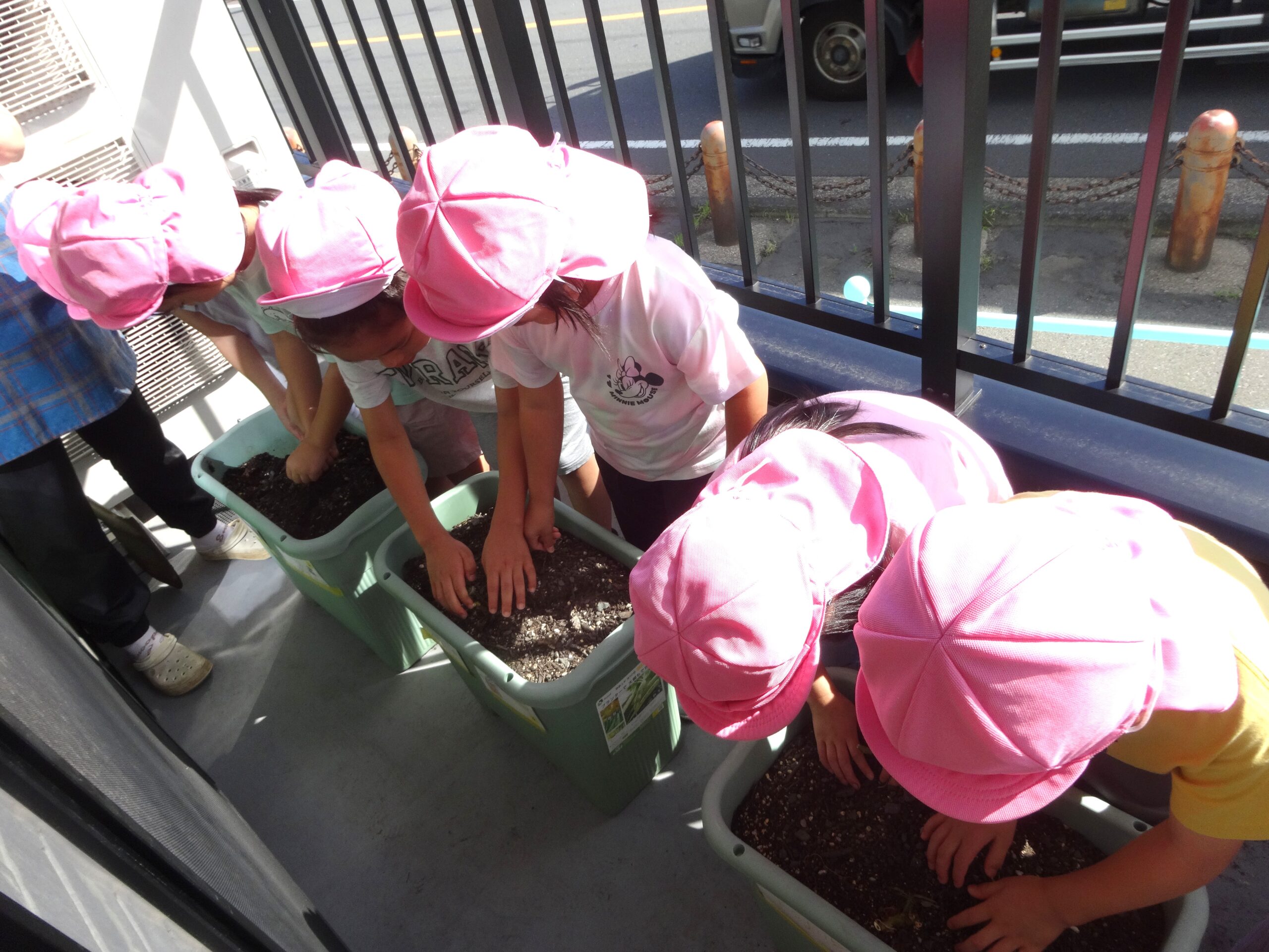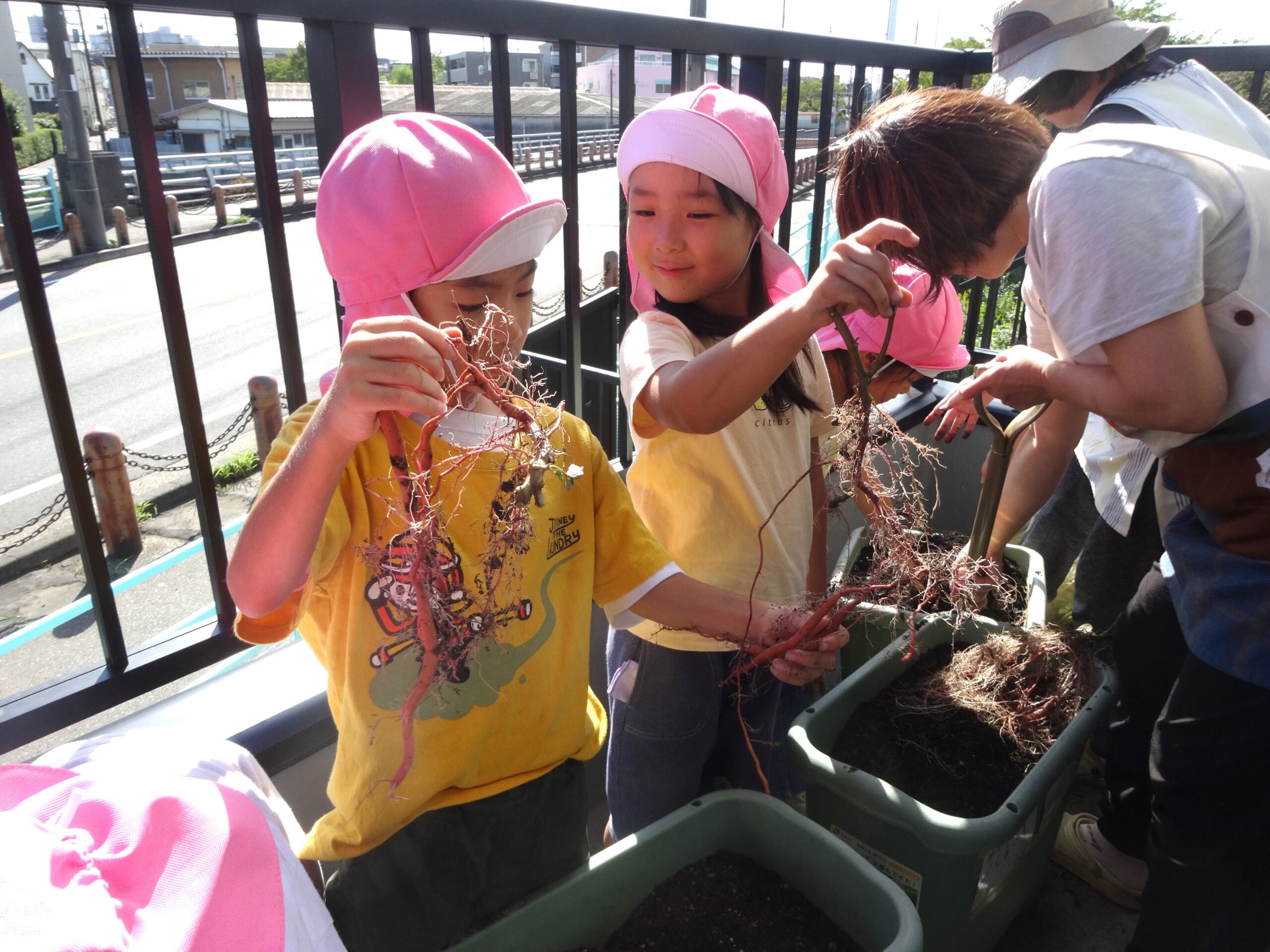 午後はさくら組さんが食育の一環で栽培していたさつまいもの収穫です。おいもができているかな・・・