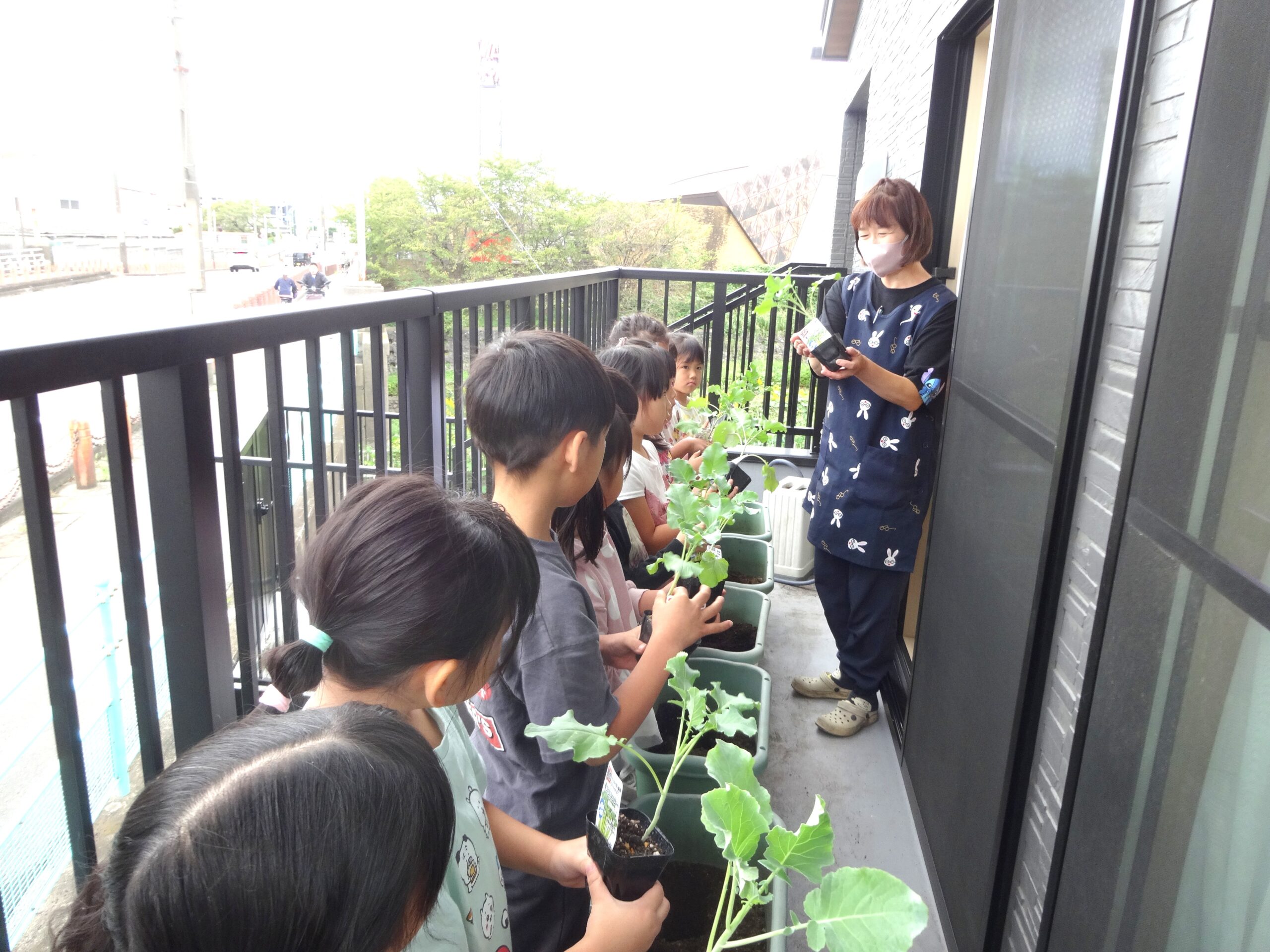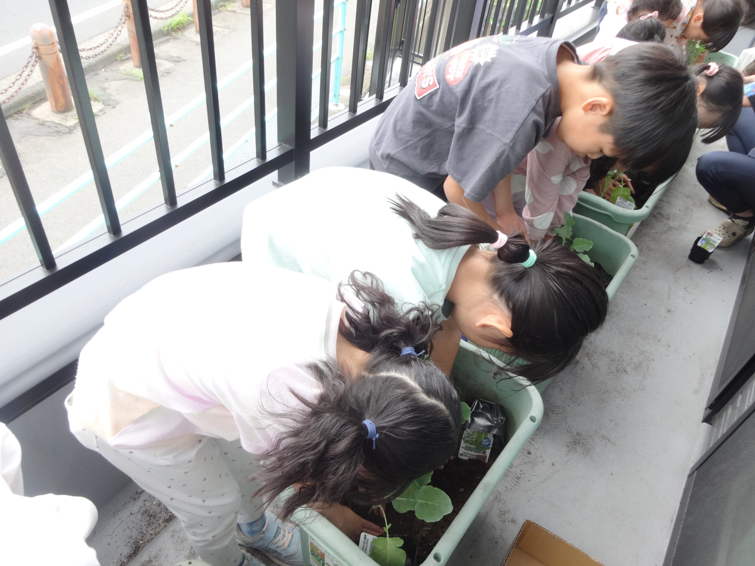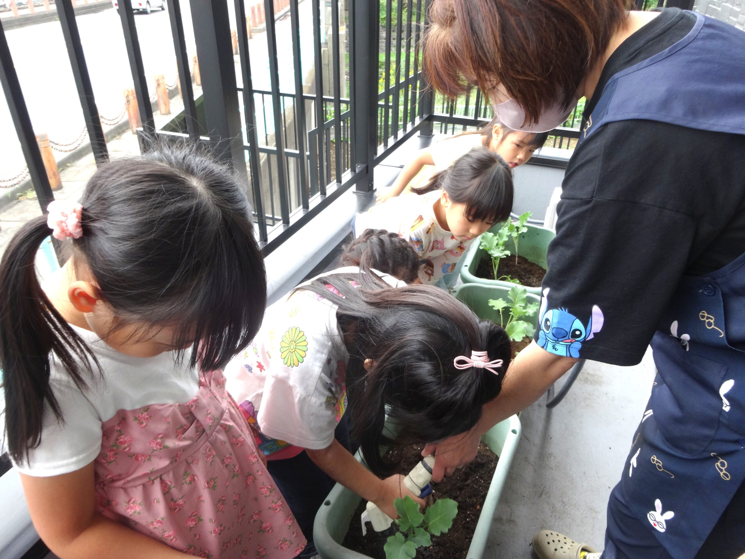 苗を土に植えた後は、大きく育つように願いをこめながら、ひとりずつ水やりをしました。収穫できる日を楽しみにお世話を頑張ろうね(^^)