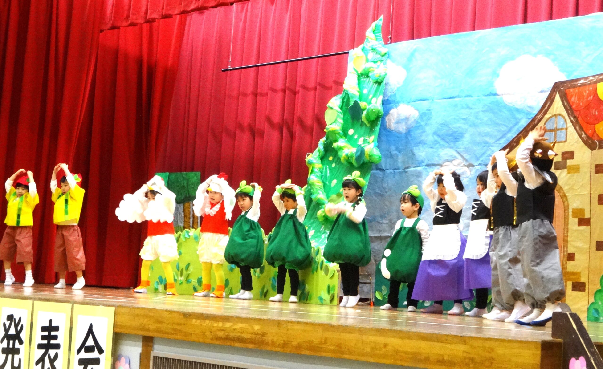 ばら組(3歳児クラス)は「ジャックとまめの木」の劇です。元気に歌を歌ったり、上手にセリフを言うことができました(^^)
