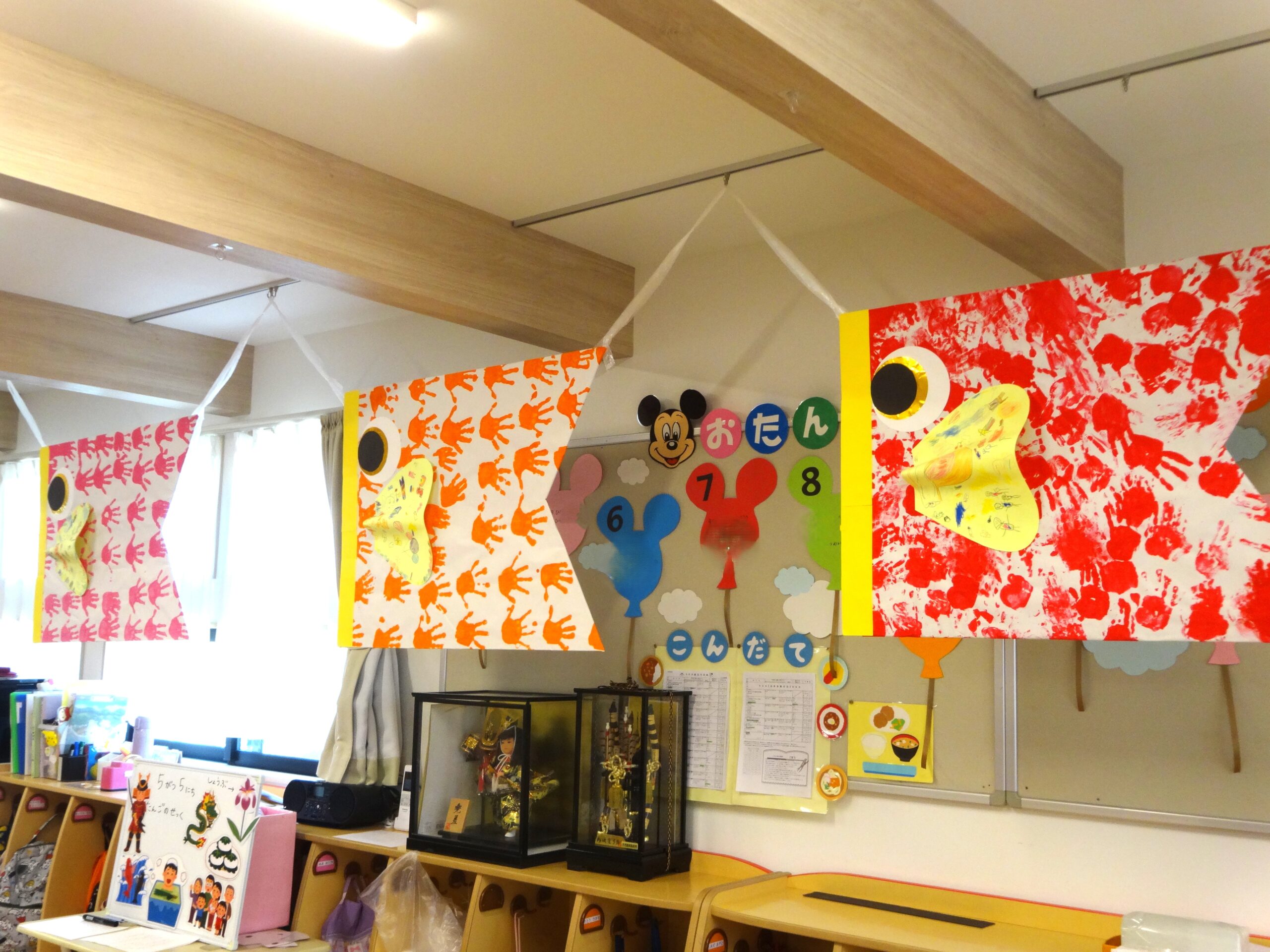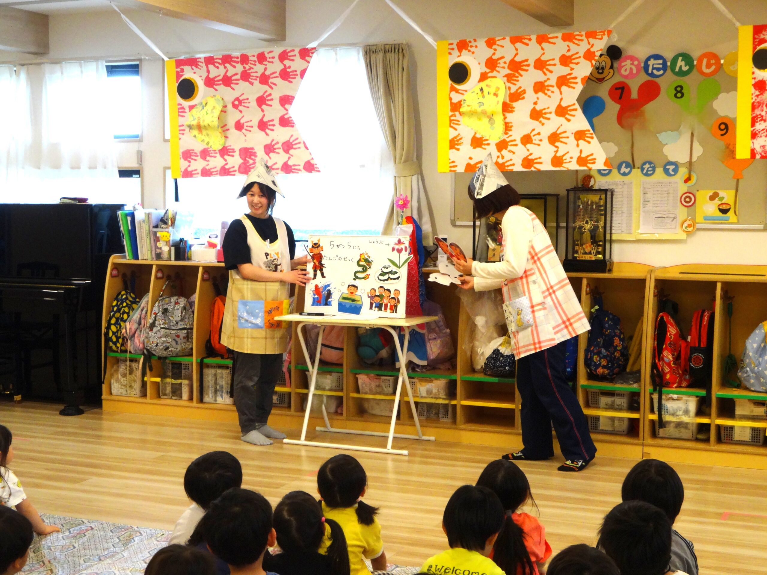 幼児クラス(3~5歳児クラス)のみんなで作ったこいのぼりの前で、先生からこどもの日の由来のお話を聞きました。