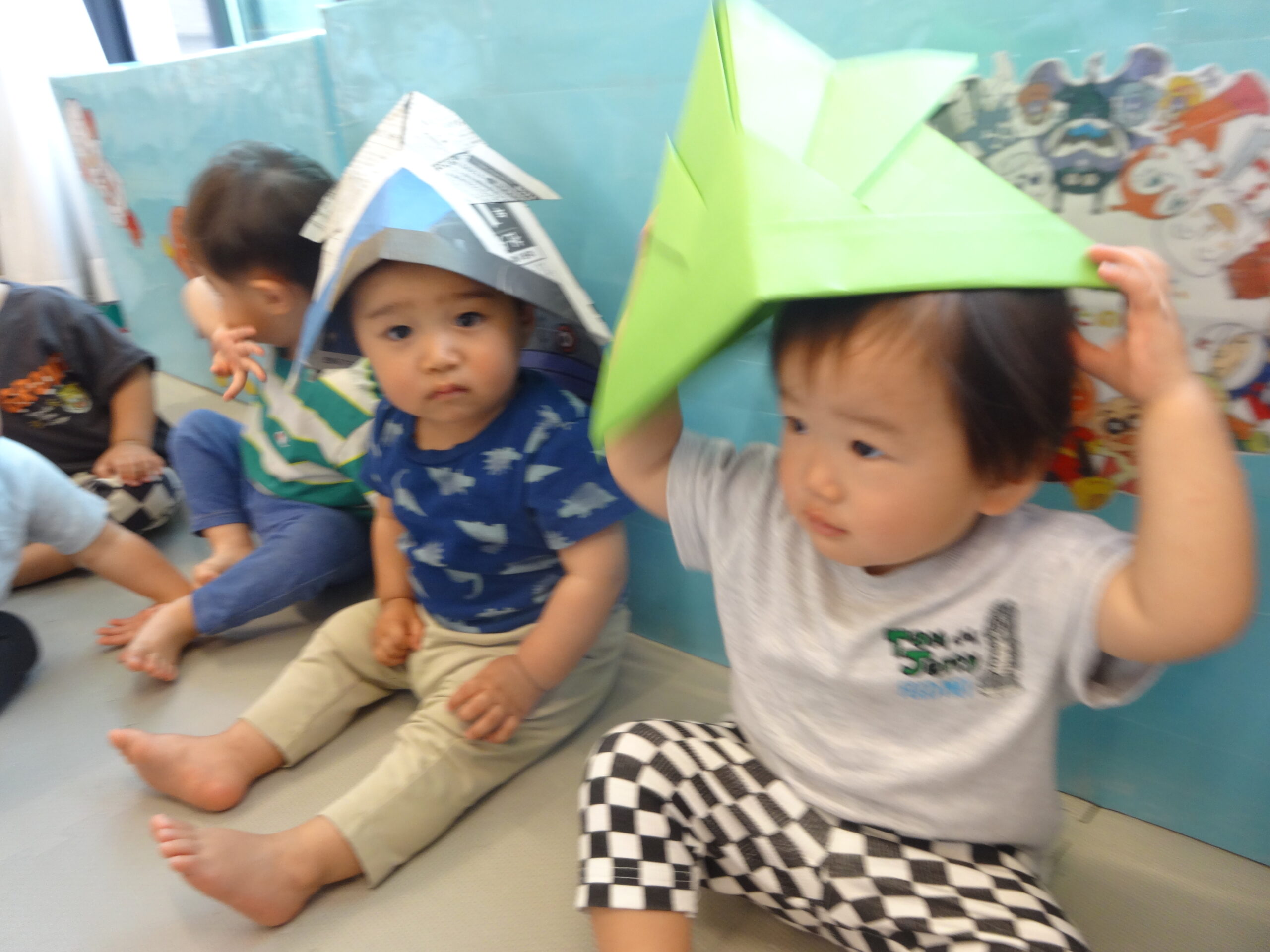 乳児クラスでは先生手作りの兜をかぶせてもらっていましたよ。兜をかぶらせてもらってご満悦の子ども達でした(^^)